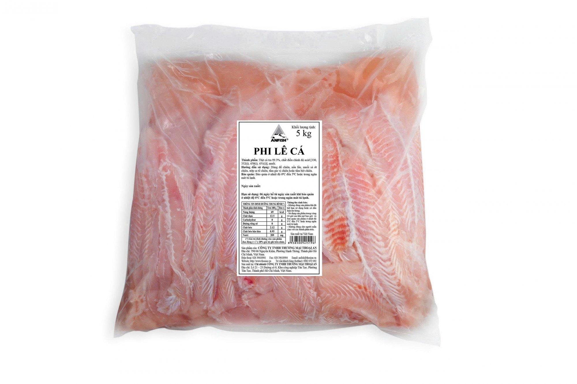 1. Thành phần: Thịt cá tra 99.3%, chất điều chỉnh độ acid [330, 332(i), 450(i), 451(i)], muối.
